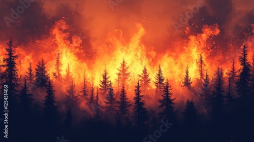 Forest fire raging at night, intense flames engulfing trees, smoky atmosphere, environmental disaster