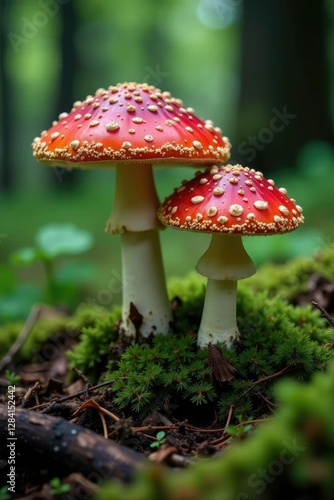 Forest floor with amanita fly agaric and ferns, wild mushroom species, wild mushroom caps, fungal kingdom