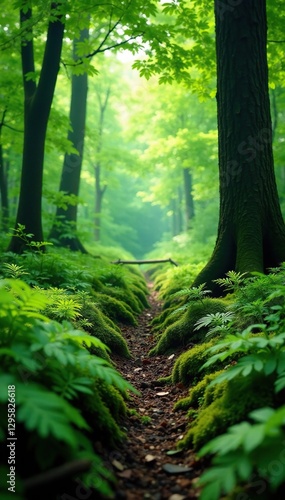Forest floor with ferns and moss under a canopy of leaves, forest, landscape, foliage