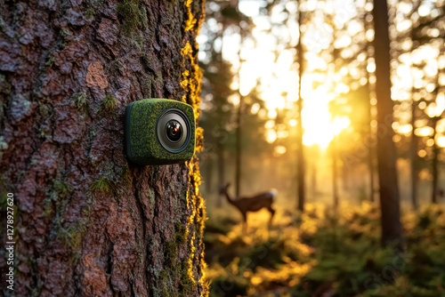 Forest monitoring system. Close-up of moss-covered wildlife camera mounted on tree trunk observing deer in sunlit forest during golden hour.