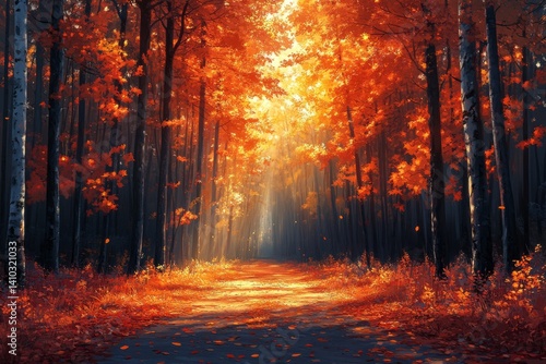 forest path covered with fallen autumn leaves, golden sunlight filtering through tall trees, deep natural colors, crisp textures