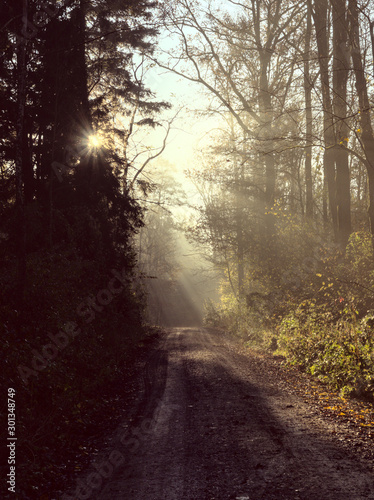 Forest path with early morning sun rays shining through the branches