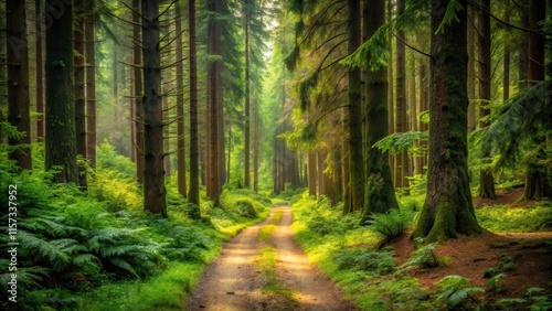 Forest Pathway in Lush Evergreen Wilderness, evergreen trees, dense foliage