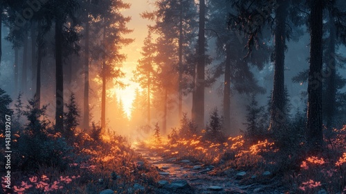 Forest scene with sunlight shining through trees and flowers in the foreground.