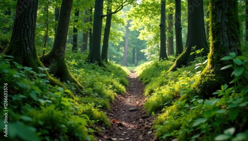 Forest trail meanders through dense underbrush and moss, terrain, natural, underbrush
