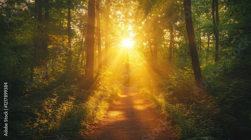 Forest trail with sunlight, close-up of path with sunlight filtering through trees, peaceful setting