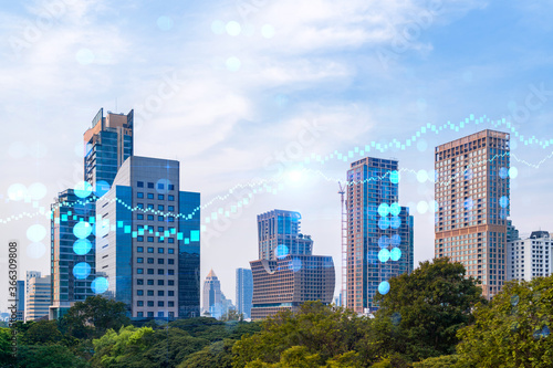 Forex and stock market chart hologram over panorama city view of Bangkok, the financial center in Asia. The concept of international trading. Double exposure.