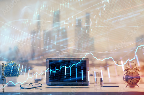 Forex graph hologram on table with computer background. Multi exposure. Concept of financial markets.