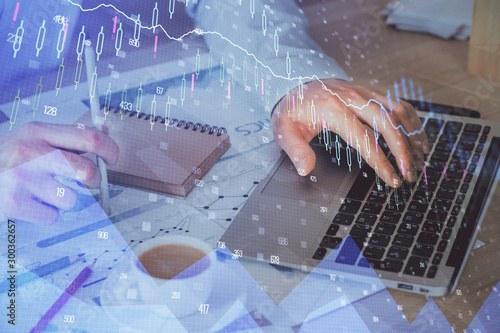 Forex graph with businessman working on computer in office on background. Concept of hardworking. Double exposure.