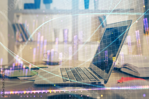 Forex market graph hologram and personal computer on background. Multi exposure. Concept of investment.