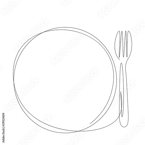 Fork and plate line drawing. Vector illustration