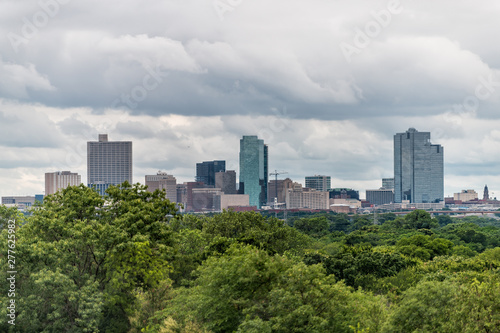 Fort Worth city in Texas with green trees in park and cityscape skyline and cloudy day