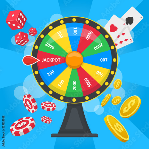 Fortune wheel concept. Casino lucky wheel game, gambling fortune wheel with dice, cards, and chips vector background illustration. Lottery spinning wheel poster