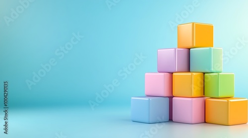 Foundation blocks rising into a tower, illustrating business success and expansion, clean lines, corporate colors, creative perspective
