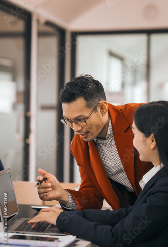 Four asian people in an office, working together on laptops, discussing tasks. annual gathering where attendees share and discuss opinions, presentation teamwork group meeting laptop in boardroom