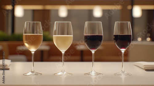 Four beautifully arranged wine glasses showcasing different varieties sit on a sleek table in a warm, inviting restaurant environment