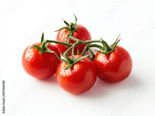 Four bright red tomatoes, still attached to their vine, sit on a white background.