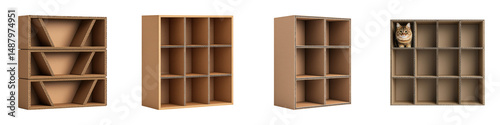 Four cardboard shelving units with various compartment arrangements, one featuring a cat in the top right cubby.