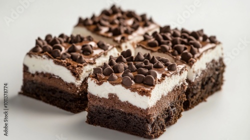 Four chocolate brownies with white chocolate frosting and chocolate chips on top.
