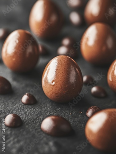 Four chocolate eggs with glossy, dark shells next to a pile of whole pieces of cocoa butter