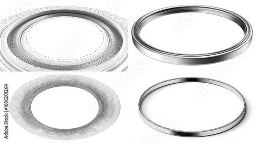 Four circular metal frames in grayscale. Two have decorative, textured inner rims, while two are simple, smooth metal rings