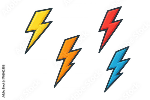 Four colorful lightning bolt icons striking on a transparent background, ideal for representing concepts related to electricity, power, and energy