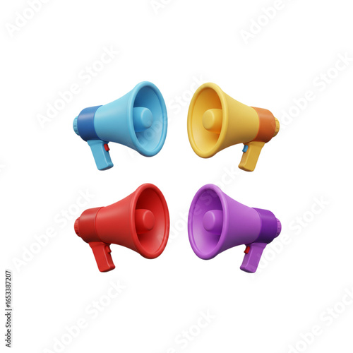 Four colorful megaphones arranged in a square on a black background representing communication and alerts