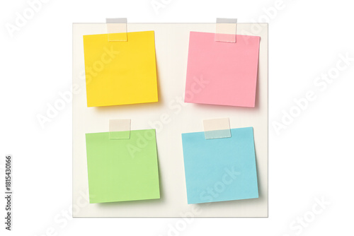 Four colorful sticky notes on a blank board with tape, creating a creative message or reminder space, transparent background