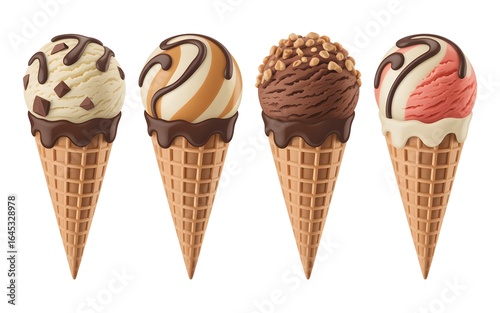 Four delicious ice cream cones with chocolate drizzle and toppings isolated on white background