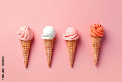 Four different flavors of popsicles in cones. Ice cream on a pink background. Copy space. Generative AI