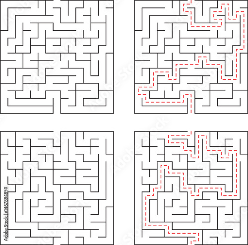 Four different square mazes with one maze solution highlighted in red color on a white background