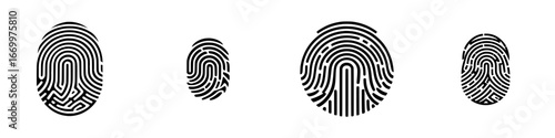 Four distinct fingerprint patterns in black and white, minimalist monochrome icons