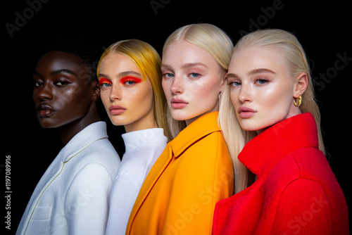 Four diverse models showcase vibrant fashion and striking makeup in a stunning studio setting