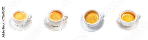 Four Espresso Cups on Saucers with Rich Crema, Isolated on Black PNG set Transparent backround