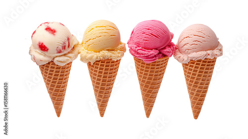 Four Flavor Ice Cream Cones – Delightful Summer Treat Collection, Isolated on White Background