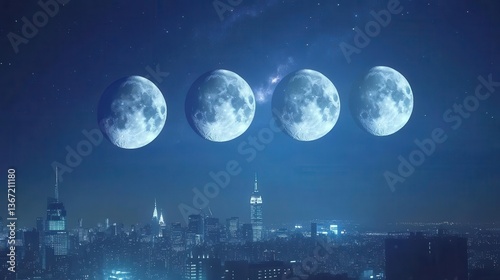 Four Full Moons Over a Vibrant Cityscape Under a Starry Night Sky