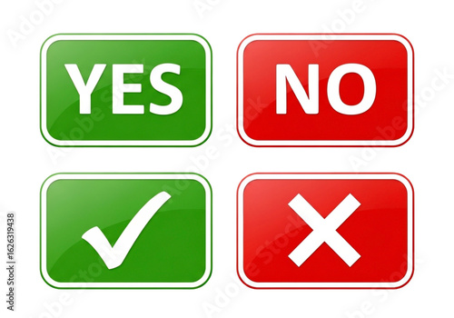 Four glossy rounded square buttons displaying yes and no text with a green checkmark and a red cross symbol isolated on transparent background
