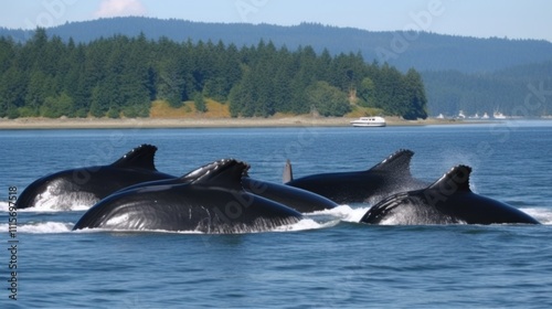 Four humpback whales swimming in calm waters near a forested shoreline.