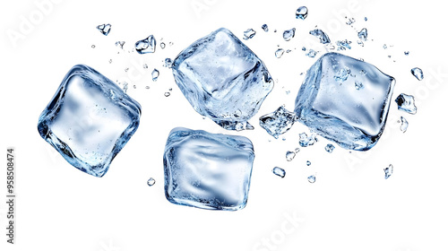 Four Ice Cubes Falling Through Water with Air Bubbles on Transparent Background