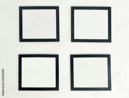 Four identical empty frames hang on white wall