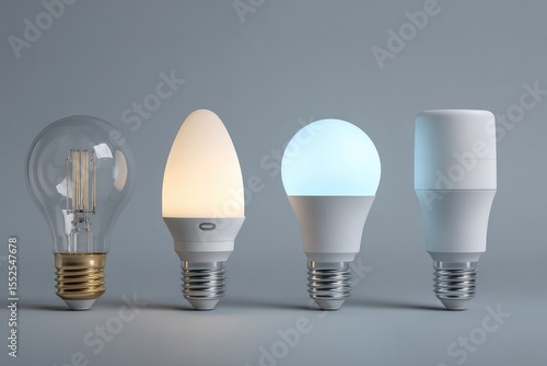 Four LED light bulbs of varying shapes and illuminated colors on a neutral background