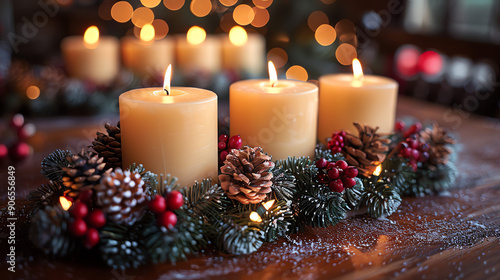 Four lit candles are arranged in a centerpiece of pine branches, pinecones, and red berries.