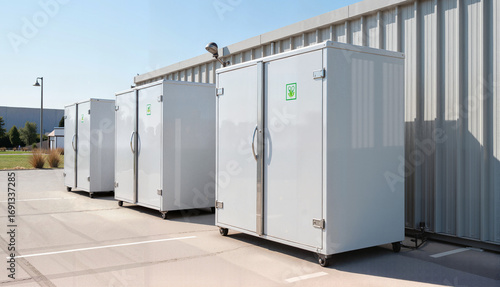 Four modern composting bins arranged neatly against an industrial backdrop, showcasing a sustainable waste management concept for gardening and environmental businesses