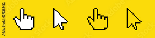 Four pixelated cursor icons, including arrows and hands, displayed on a yellow backdrop.