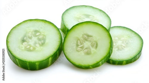 Four slices of fresh cucumber arranged neatly on a clean white surface, showcasing their vibrant green color and crisp texture.