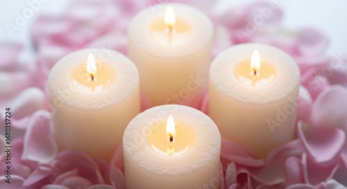 Four softly glowing candles nestled amongst delicate pink flower petals creating a serene and tranquil atmosphere