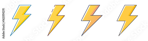 Four stylized cartoon lightning bolt icons with varying colors and outlines