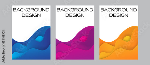 Four vertical abstract design mockups with layered wavy shapes in blue, magenta, orange, and turquoise palettes on white background, modern 3D graphic design