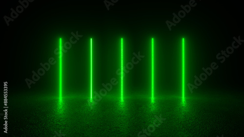 Four vertical green neon lights illuminate a dark, reflective surface.