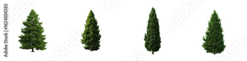 Four vibrant green evergreen trees of varying shapes and sizes Isolated conifer collection with lush foliage